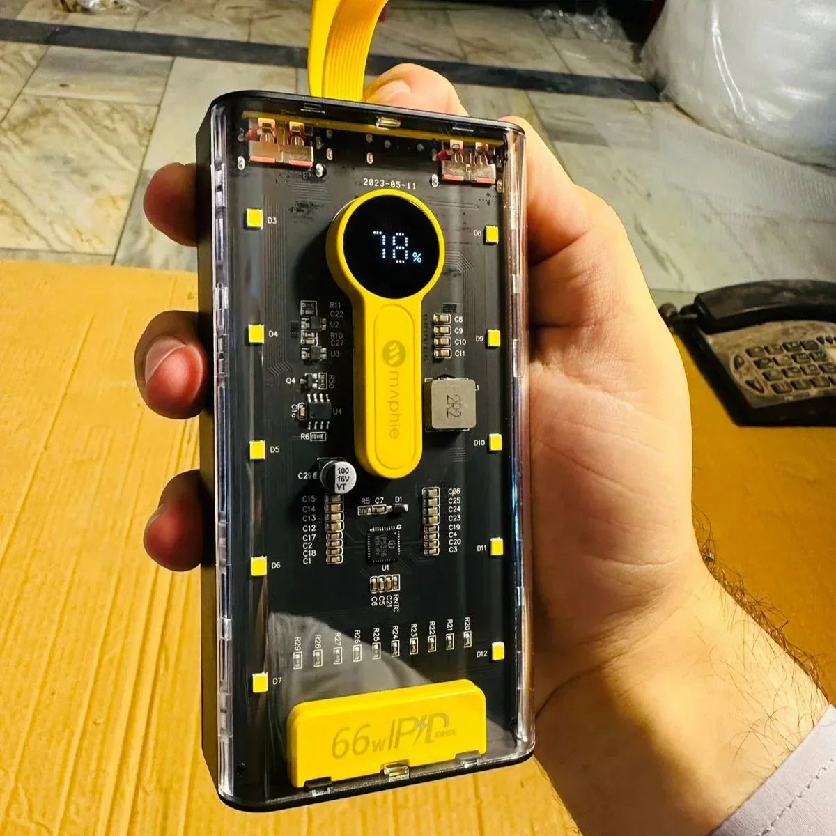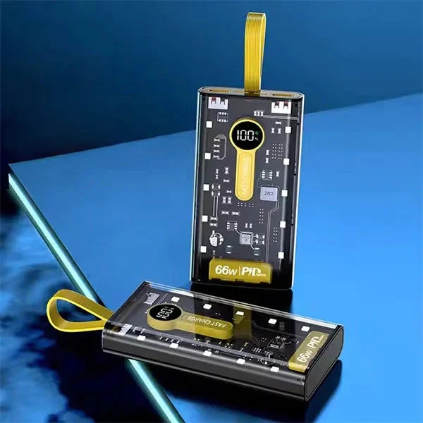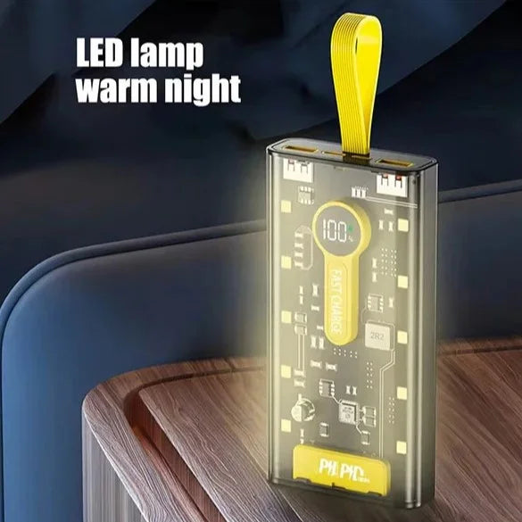 Premium 20000mAh power bank with ultra-fast charging, multiple ports, and a stylish transparent amphere light. Compact, portable, and safe—ideal for travel, emergencies, and keeping all your devices charged effortlessly.