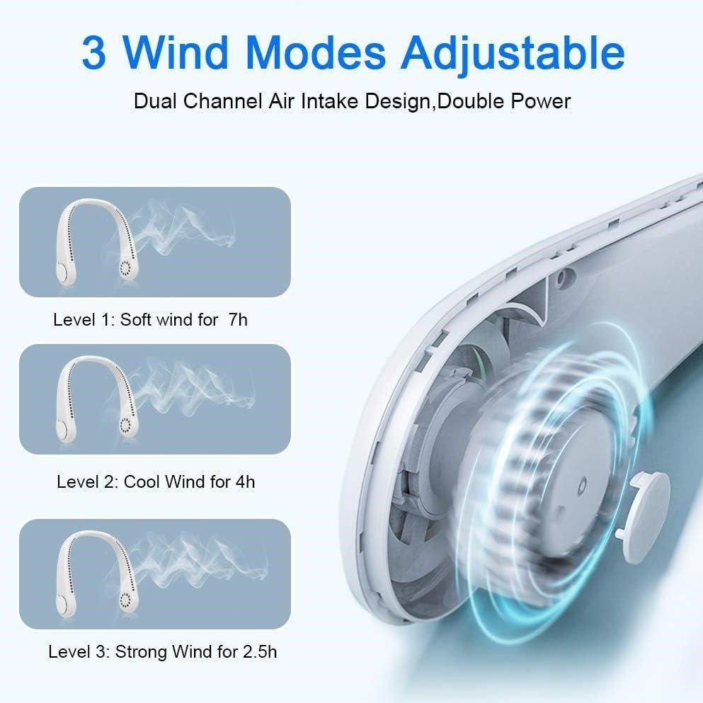 Lightweight and stylish wearable neck fan with bladeless design, adjustable gooseneck, and 3-speed fast cooling. Perfect for outdoor activities, travel, sports, and personal comfort during hot weather.