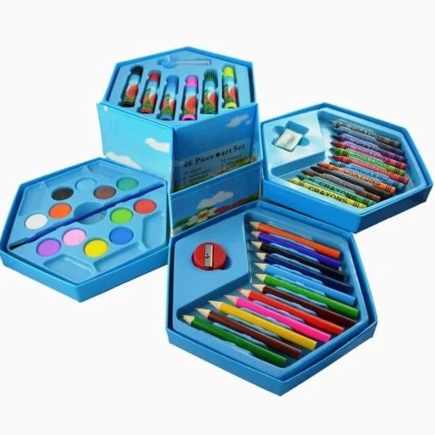 • 46-piece complete art set including color pencils, crayons, watercolors, and sketch pens.