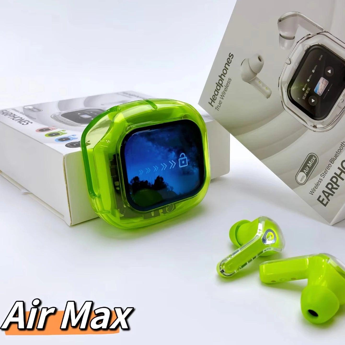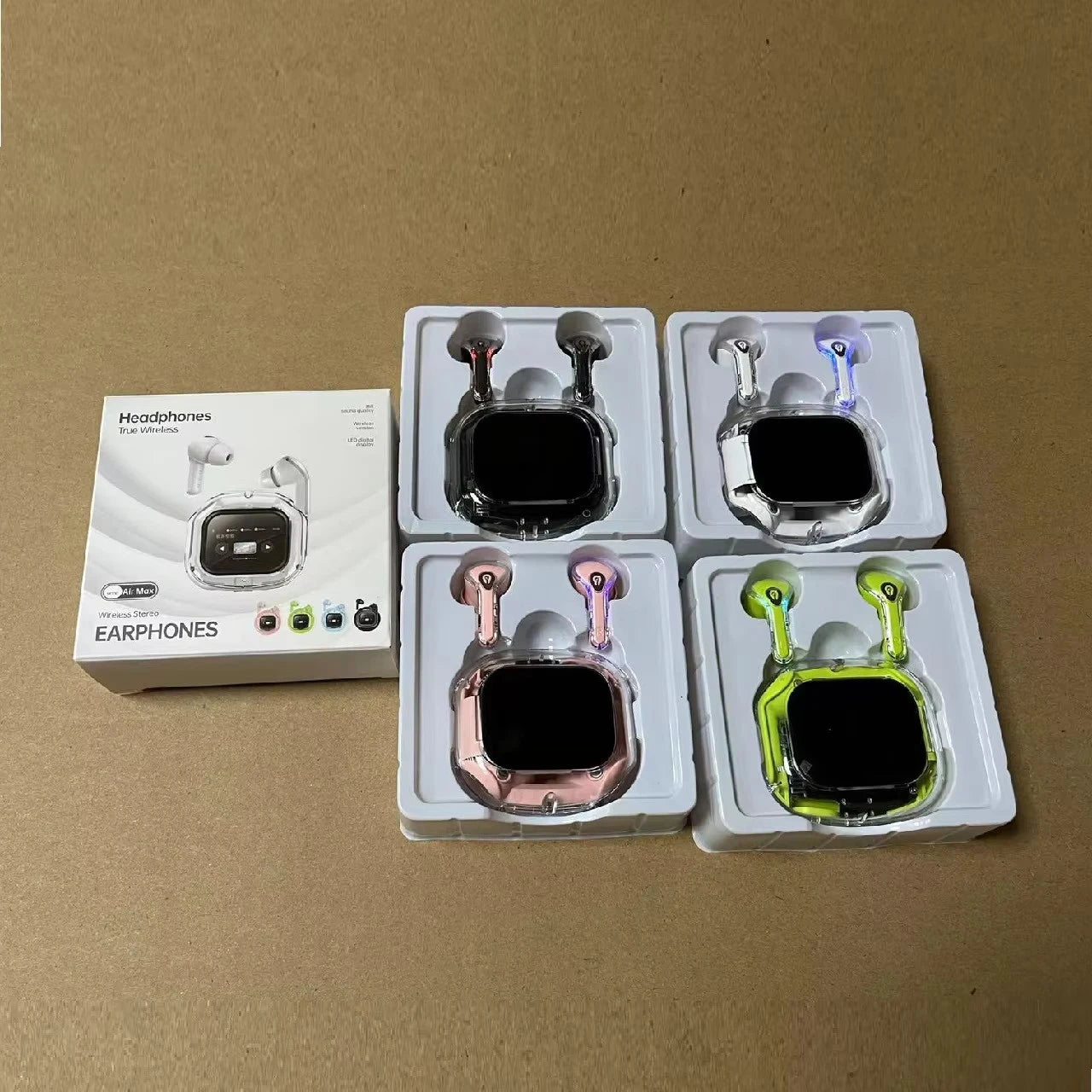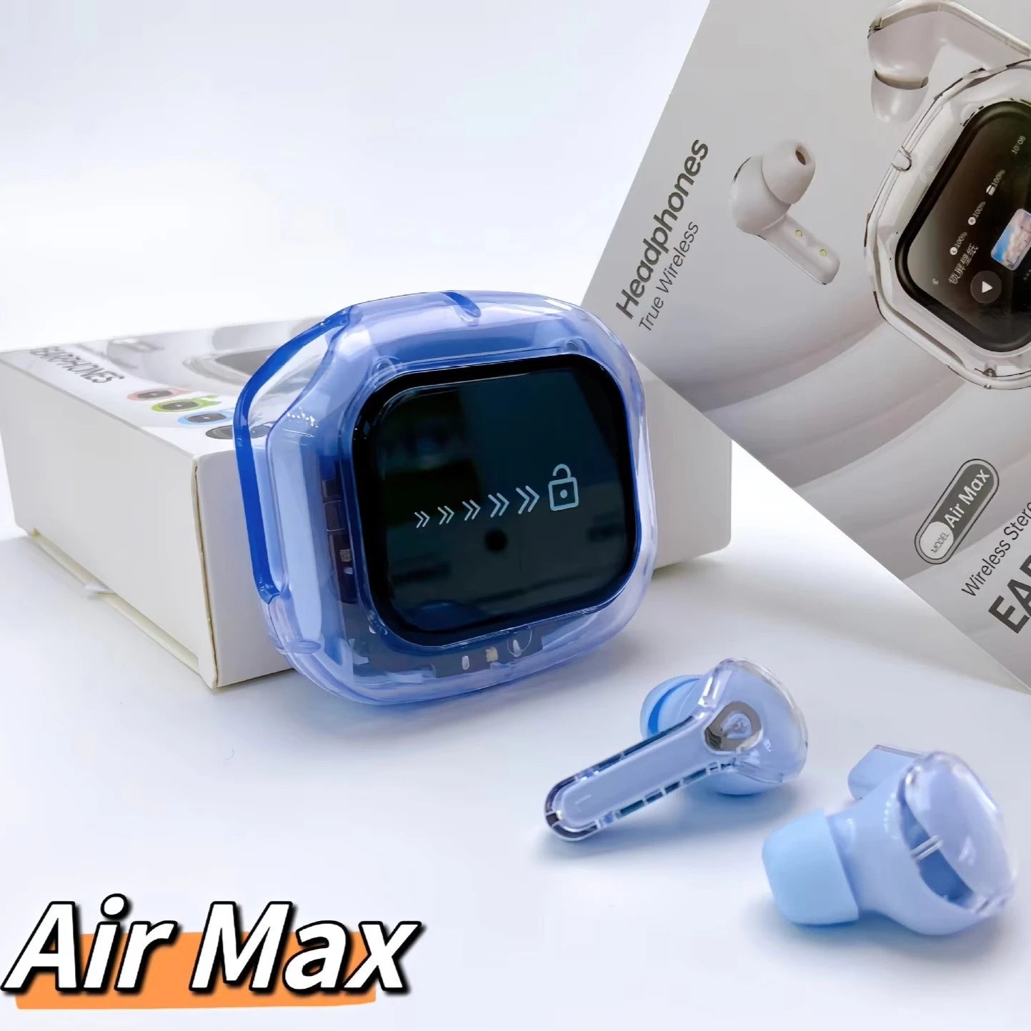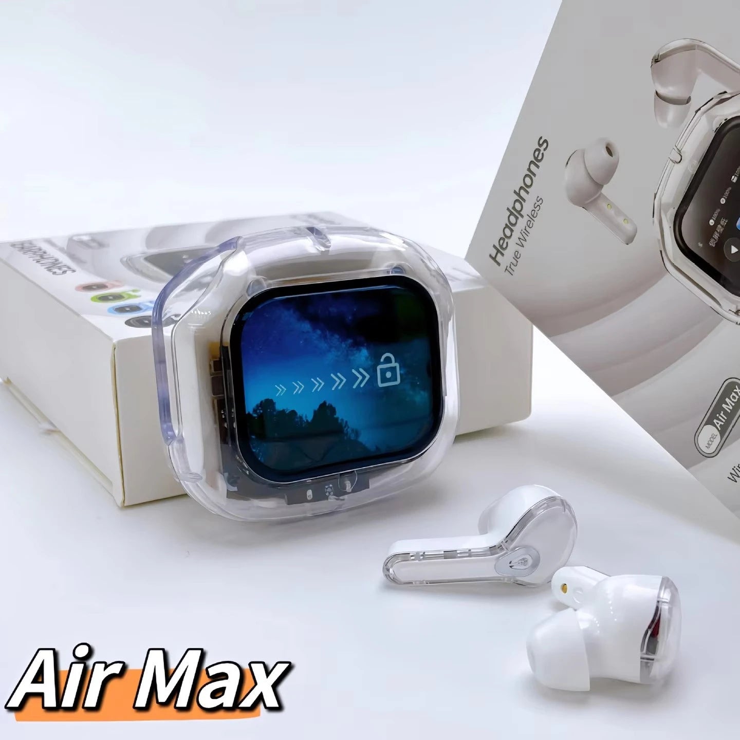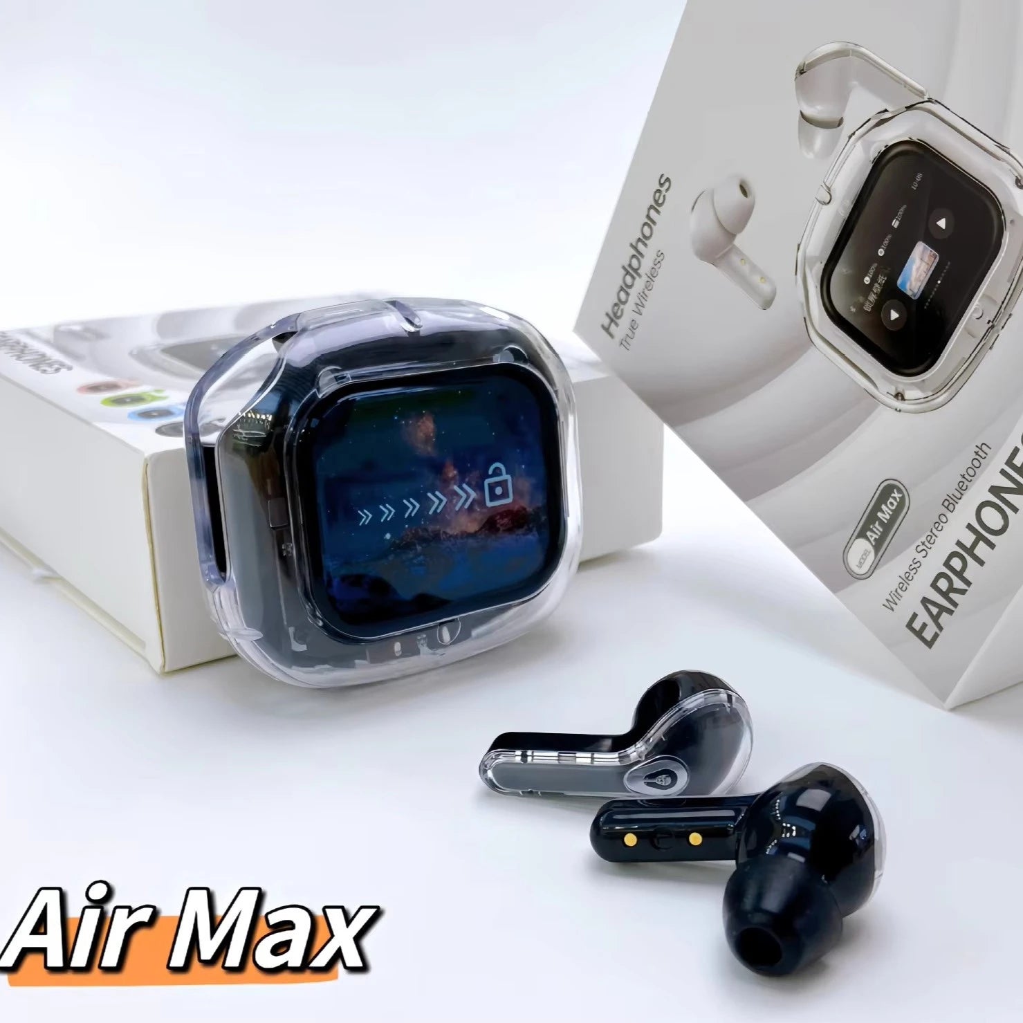 AirMAX Ultrapods premium wireless earbuds hain jo modern LCD touch screen, powerful HIFI sound, aur advanced noise cancellation ke sath aate hain. Sleek transparent aesthetic design, all-day comfort, aur latest Bluetooth technology ke sath yeh earbuds daily use, calls, aur music ke liye perfect choice hain.